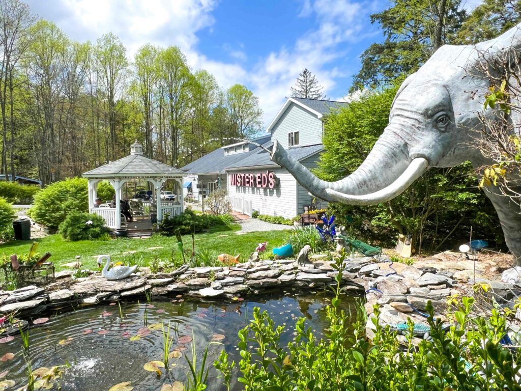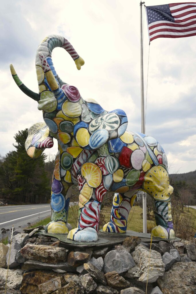 On the property’s eastern side, a multi-colored mosaic elephant named “Miss Penny Candy” greets passersby, standing underneath an American flag. This artistic elephant made a dramatic debut outside the Totem Pole Playhouse for a production honoring P.T. Barnum and then found its final home at Mister Ed’s in 2012.