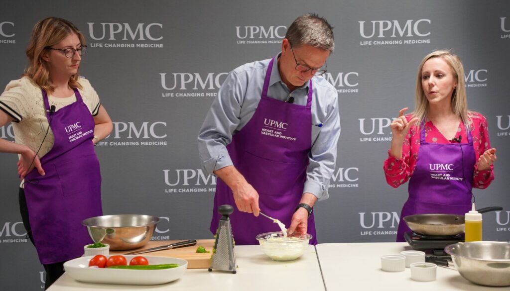 As part of a series of these holistic programs, UPMC hosted the “Cooking with a Cardiologist” event where participants learned about various heart-healthy meal preparations. Michael Bosak, MD, and Ashley Zinda, DO, both cardiologists with UPMC Heart and Vascular Institute, and Shanna Shultz, RD, LDN, dietitian from The Giant Company, paired the cooking demonstration with nutrition tips and new ingredients to try in the kitchen. A consistent partner of the program for over ten years, The Giant Company provided the recipes, dietetic guidance and ingredients for the event.