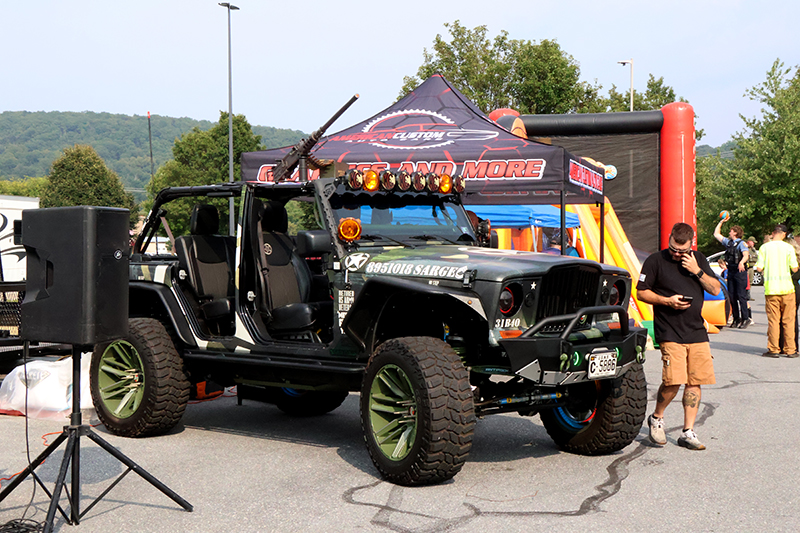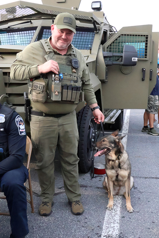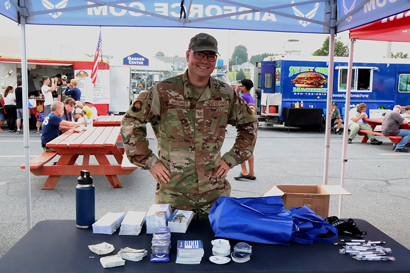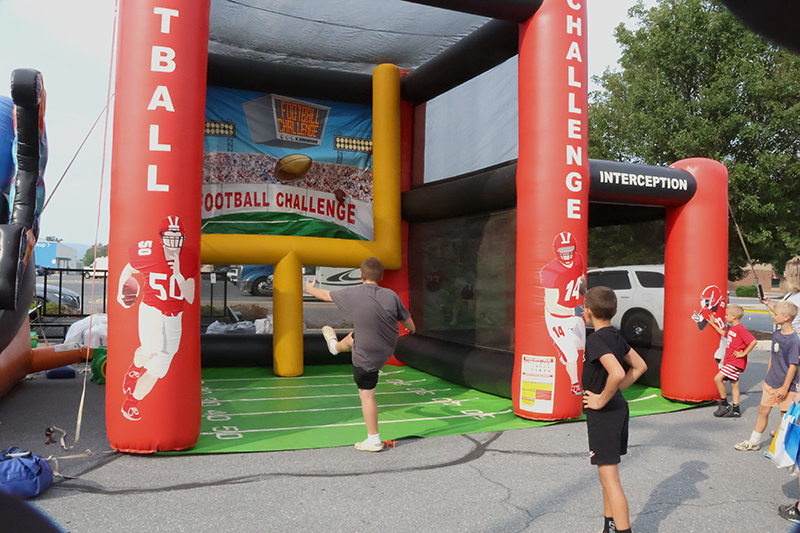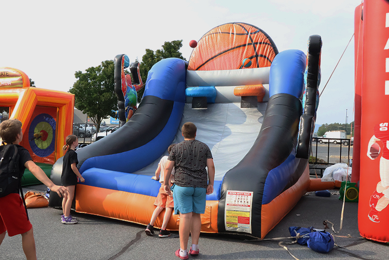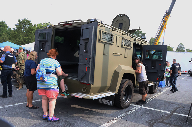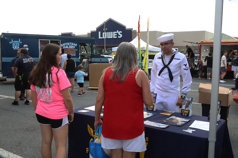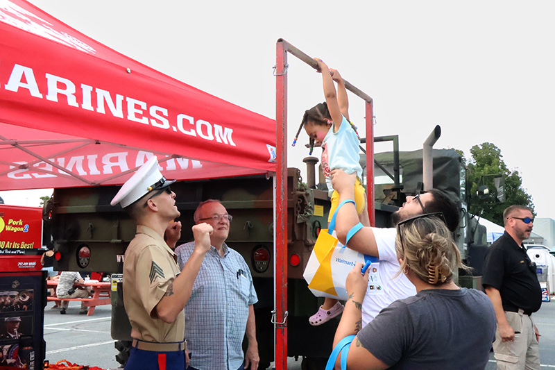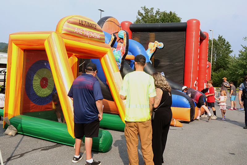The evening showcased local law enforcement, fire and EMS representatives alongside community partners. Attendees enjoyed basketball, football and axe-throwing inflatables, while food trucks served a variety of dishes. Military vendors from the Navy, Air Force and Marines engaged the crowd, with the Marines offering a stationary pull-up bar for children.