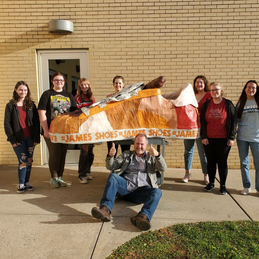 Waynesboro Area Senior High School teacher Melanie Erb, fourth from left, and her National Art Honor Society students were recognized by Mainstreet Waynesboro Inc. for redesigning and repainting the giant James Shoes sneaker for the recent Boro Blast. The original shoe was created by Kaya Johnson, a WASHS grad.