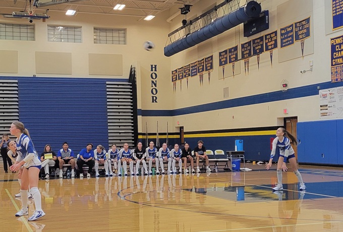 After a short intermission, the varsity teams came out to a thunderous ovation. Both teams were well represented by fans and the excitement in the air could be felt as the game began. The home team was at the top of their game and quickly established a large lead at one point leading 16-9. While the points earned were not easy with long rallies between both sides, the ball just seemed to land in the Maidens favor and they won game one 25-11.