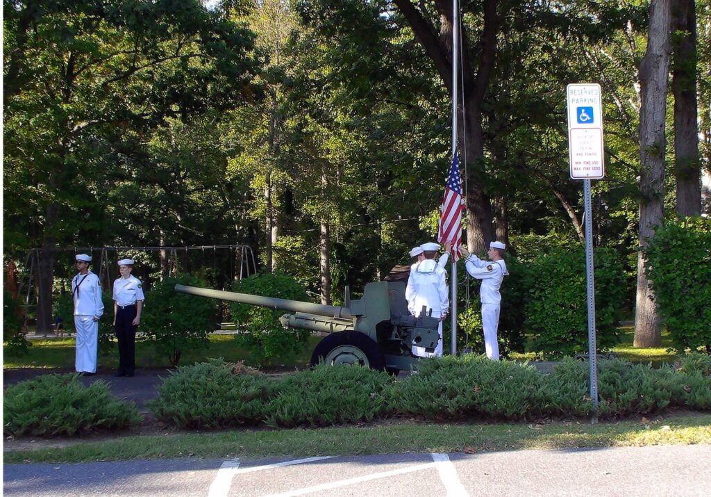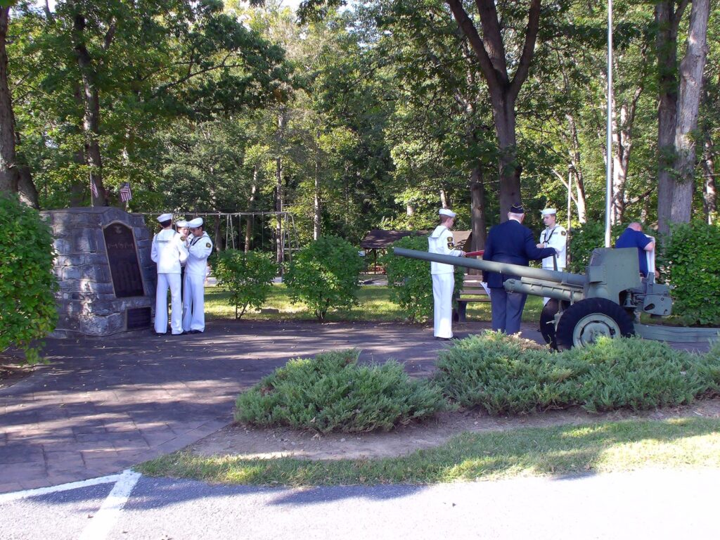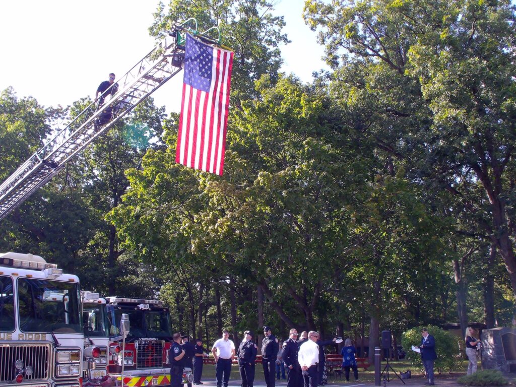 The ceremony began with the posting of colors by the U.S. Naval Sea Cadets, Pennsylvania Blue Jackets Division.  The weather was pleasant and sunny on that early September evening as the colors that represents our nation hung at half-mast on the flag pole and a large flag hung overtop the ceremony from the extended ladder of Truck #2 of the Waynesboro Fire Department.