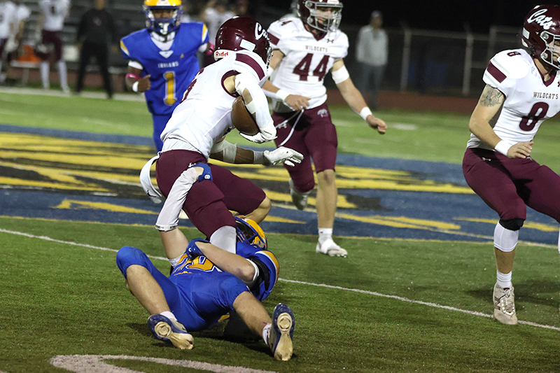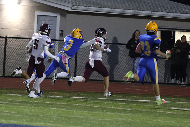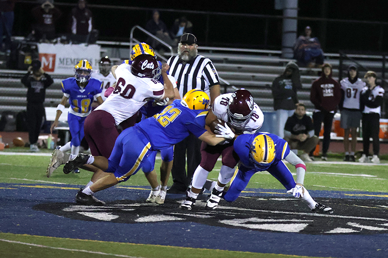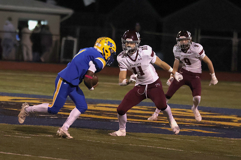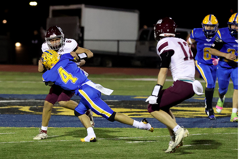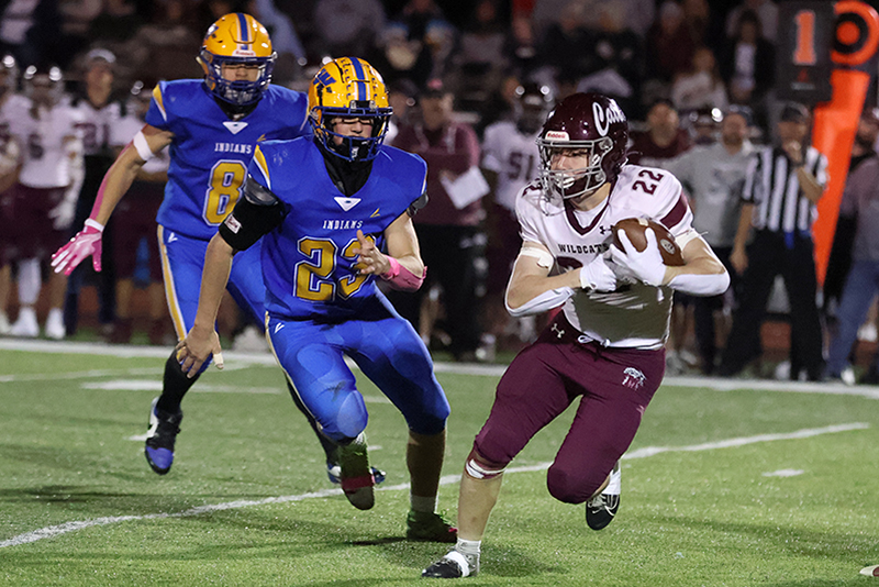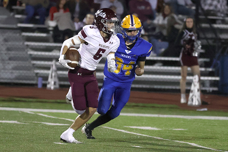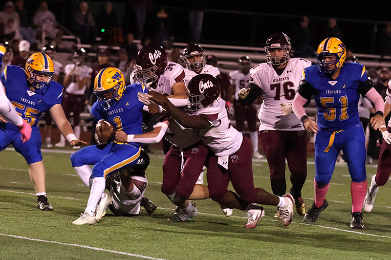 Freshman Ronan Mencia prevented Mechanicsburg from taking a potential 18-0 lead when he stopped Wildcats’ running back Rece Miller on a fourth-down play at the Waynesboro 13-yard line. Mechanicsburg tried an off-tackle run to the right side of the Indians’ defense. Still, Mencia raced into the backfield from his linebacker position and caught Miller from behind before Miller got some momentum behind him to pick up the necessary yardage for the first down. On the previous play, Smith stopped Grady Weaver for a 1-yard gain.
