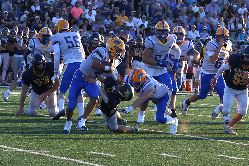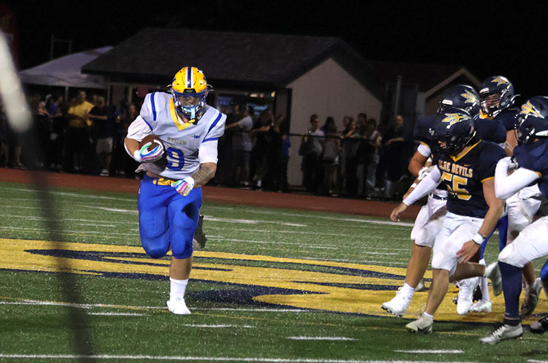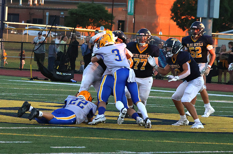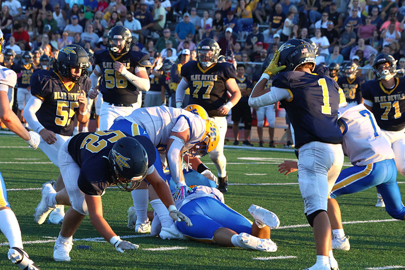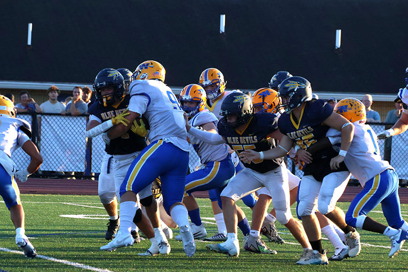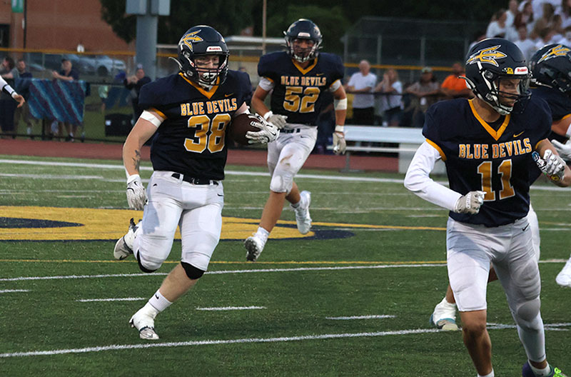 Waynesboro’s Kean Baumgardner bulled his way for two touchdowns, Steven Howard intercepted two passes, and Mitch Torbica recovered two fumbles (one on offense and one on defense). The Tribe scored two fourth-quarter touchdowns and held off a furious Blue Devils rally to etch a 27-21 victory in a non-league high school varsity football game on a hot evening at Kaley Field.