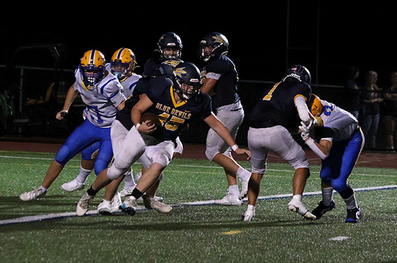 Fast forward to early in the second quarter, and G-A moved the ball from its 20-yard line to the Indians’ 24, thanks to a 24-yard run by Lars Galinanes. Galinanes was a carbon copy of Baumgardner, whose running style is straight-ahead, and once he got going was hard to slow down, let alone stop. But the next play, the Blue Devils coughed up the ball and Torbica recovered at the Waynesboro 24.