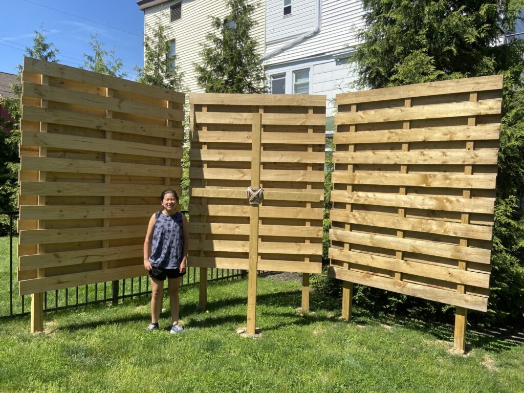 The garden features a 30-foot evergreen tree behind the three 6- by 8-foot fences that were installed. “One of the fences is parallel to the tree and the other two are diagonal to the center. There is a cross that is parallel to the center fence,” Olivia noted. “And the fence and tree will provide privacy from people walking by.”
