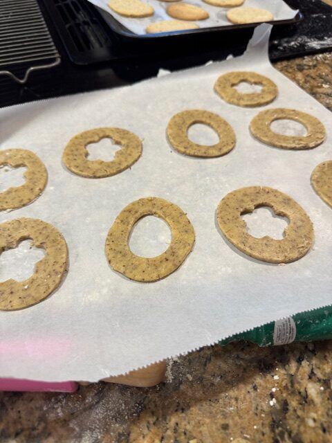 - Using the heart cutter, stamp out shapes from the middle of one half of the cookies.