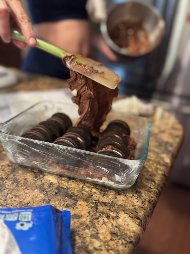 - 22 cream-filled cookies (like Oreos): 16 whole, 6 broken into small pieces for topping