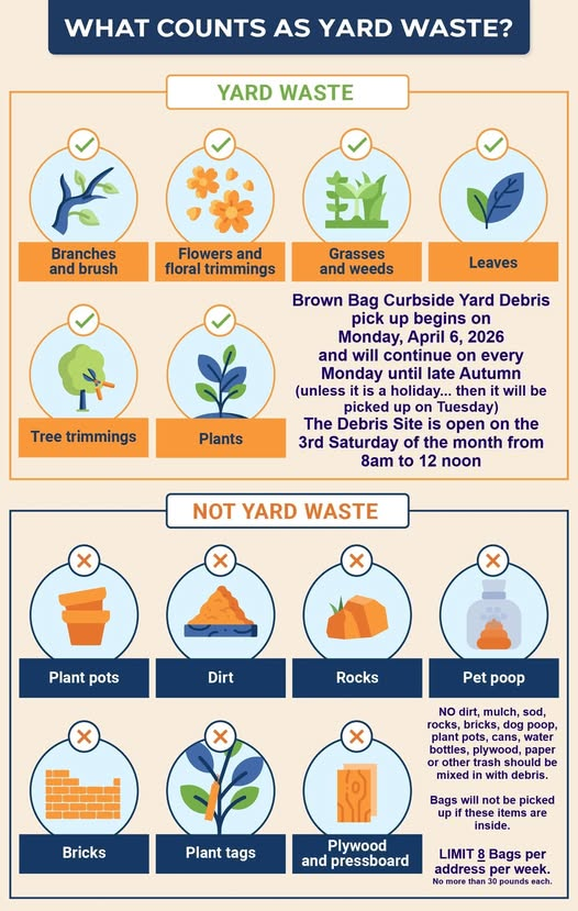 Curbside yard waste collection, known as Brown Bag Pick-up, will begin Monday, April 6. Property owners may place up to eight brown paper lawn bags curbside Sunday evening for Monday pickup. Bags left out early or exposed to rain will not be collected.